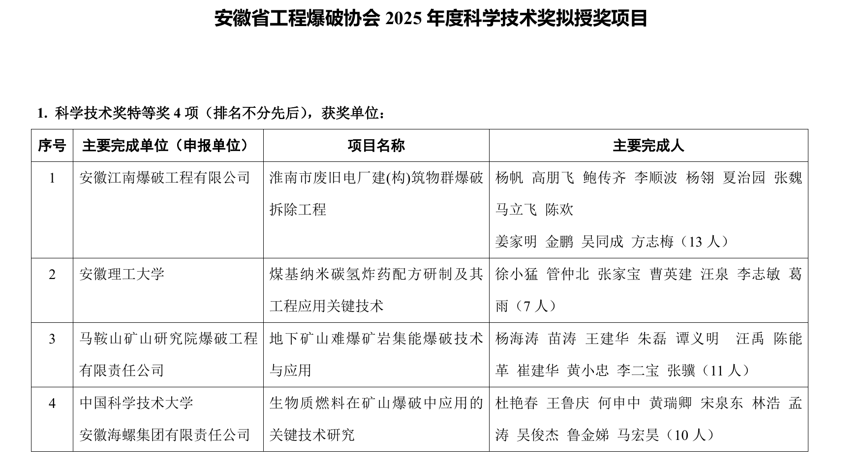 安徽省工程爆破协会科学技术奖拟授奖项目