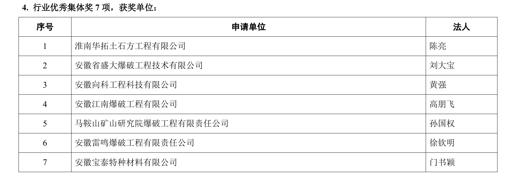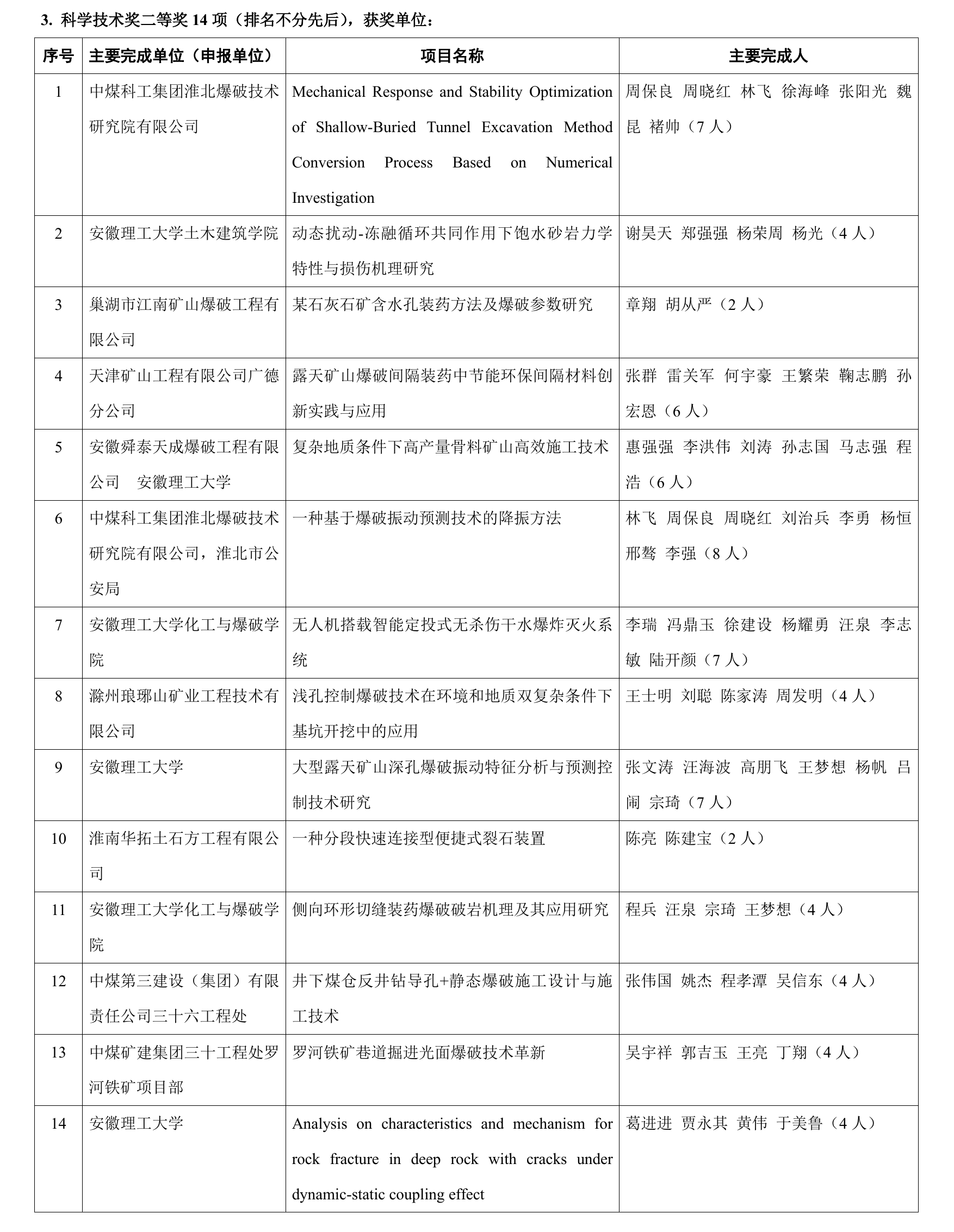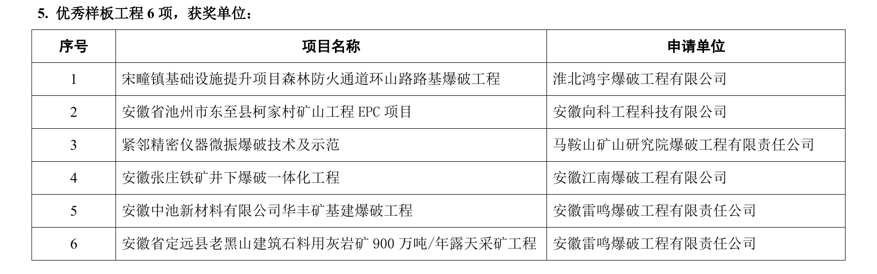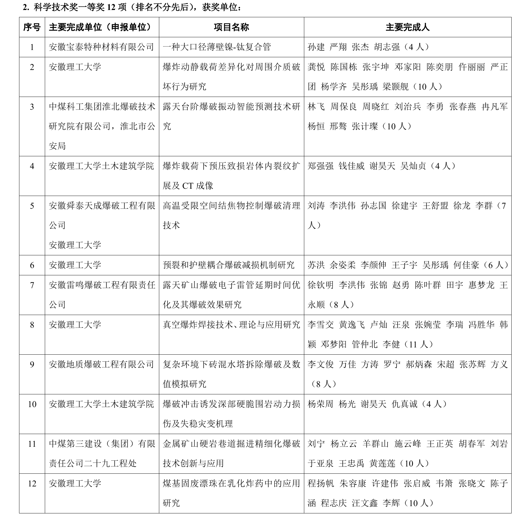 安徽省工程爆破协会科学技术奖拟授奖项目